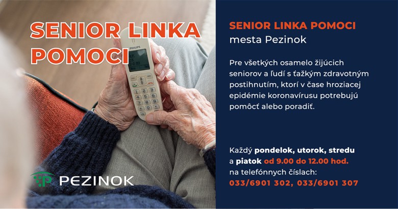 Na podporu a pomoc pre týchto obyvateľov, keďže v prípade nich chýba mestu dostatok informácií o ich sociálnej situácii, spúšťa mesto Pezinok od 23.3.2020 telefonickú Senior Linku pomoci, ktorá bude dostupná: