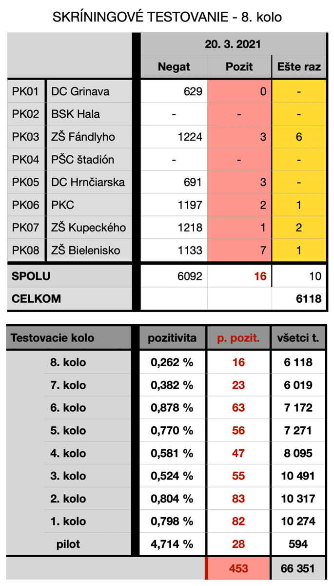 V sobotu 20. marca otestovali v 6 mestských odberných miestach 6 118 ľudí. Pozitívnych bolo 16 z nich. Predstavuje to opäť pokles oproti 7. kolu testovania z 13. marca. Súčasné percento pozitivity v mestských odberných miestach je 0,262.