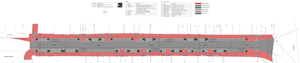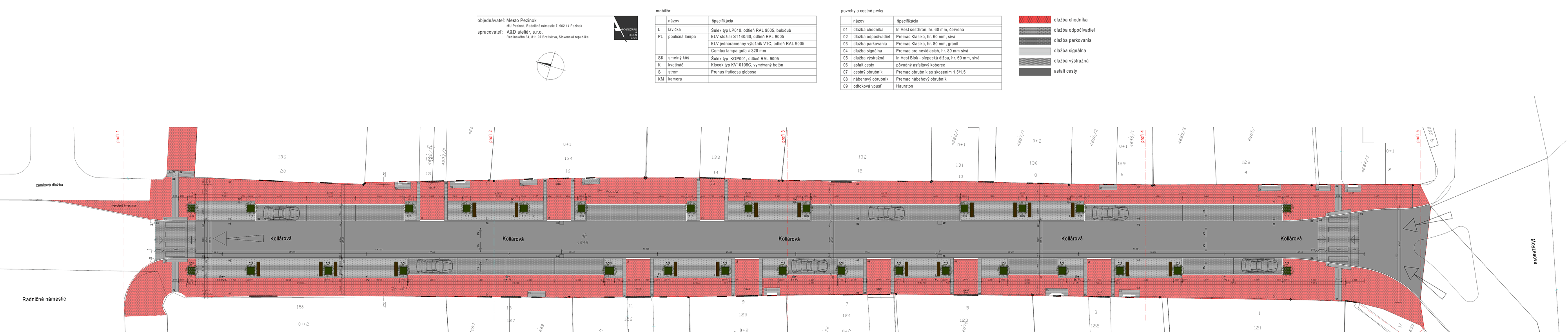 Chodníky budú mať dlažbu červenej farby, na oddychových rozšíreniach chodníka a parkovacích miestach to bude dlažba sivej farby. Na signálne a výstražné línie bezbariérového riešenia bude použitá špeciálna dlažba pre nevidiacich vo farebne kontrastnom sivom prevedení.